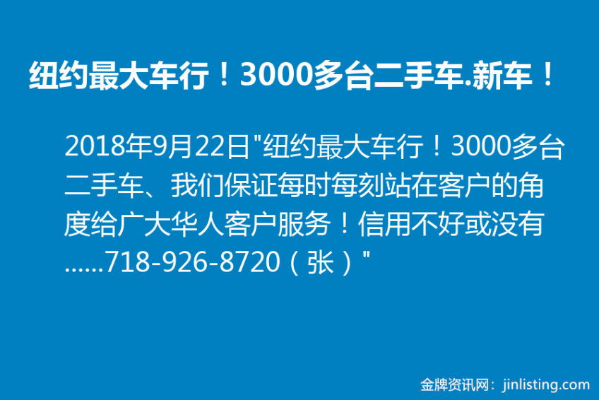 “纽约最大车行!3000多台二手车、我们保证每时每刻站在客户的角度给广大华人客户服务!