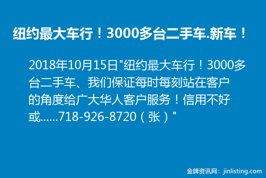 “纽约最大车行!3000多台二手车、我们保证每时每刻站在客户的角度给广大华人客户服务!