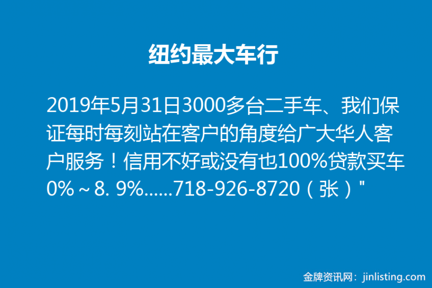 “纽约最大车行!3000多台二手车、我们保证每时每刻站在客户的角度给广大华人客户服务! 信用不好或没有也100%贷款买车(0%~8. 9%)首付30%只要有 C8卡或驾驶证就行。 当日高价现金收车$ 这里是正规车行!不是拍卖场! 帮你贷款.上牌.买保险.当天可以上路! 新车有:Toyota.Honda.chevrolet.ford.kia Jeep Acura.Ram 各种15人座! 网址:www.majorworld.com 地址:43-40 Northern Blvd Long Island city NY 11101 地铁M.R线46ST下车法拉盛公交Q66在44ST下车(提前预约法拉盛接送) 欢迎致电:718-926-8720(张)”
