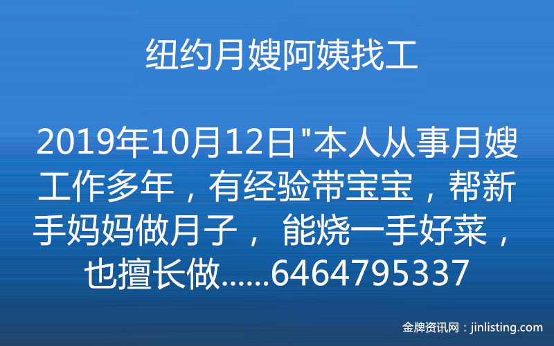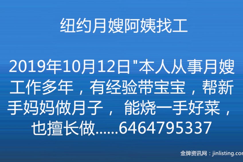 纽约月嫂阿姨找工 “本人从事月嫂工作多年,有经验带宝宝,帮新手妈妈做月子, 能烧一手好菜,也擅长做家务,性格和善开朗, 如果您有需求或身边的朋友, 请拨打电话 6464795337,我会是您的好帮手!”