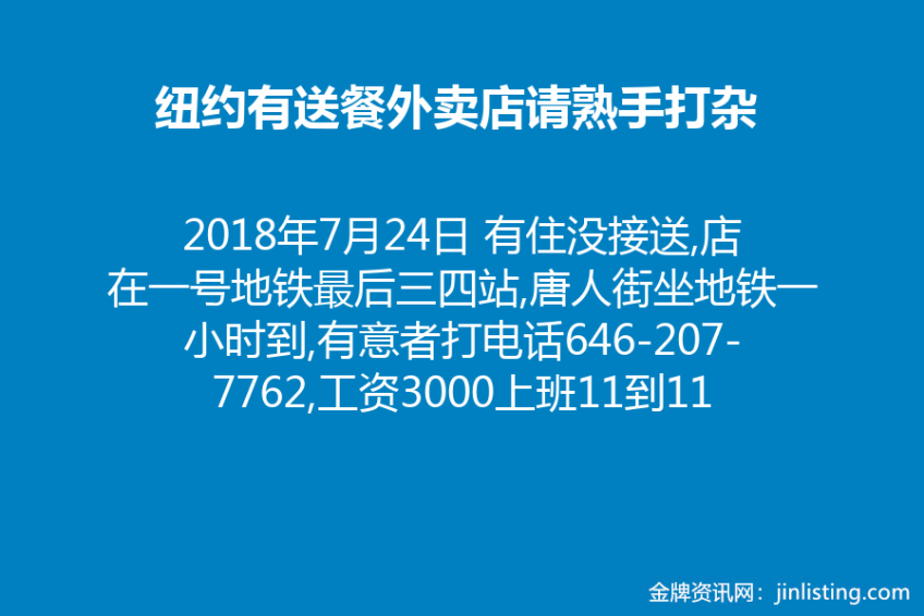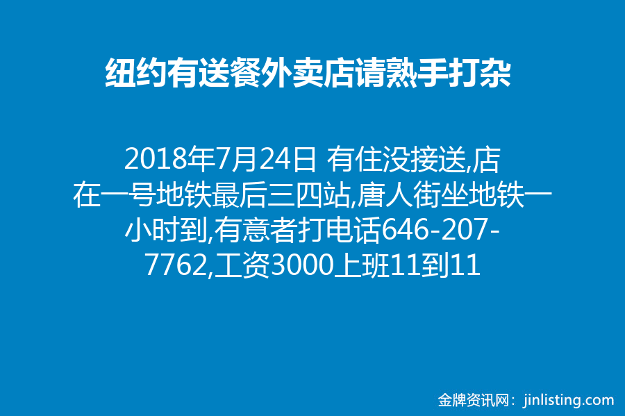 外卖店请熟手打杂 纽约有送餐外卖店请熟手打杂,有住没接送,店在一号地铁最后三四站,唐人街坐地铁一小时到,有意者打电话646-207-7762,工资3000,上班11到11
