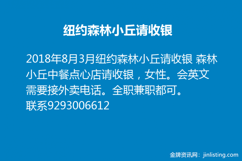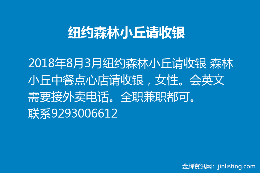 纽约森林小丘请收银 森林小丘中餐点心店请收银,女性。会英文需要接外卖电话。全职兼职都可。联系9293006612