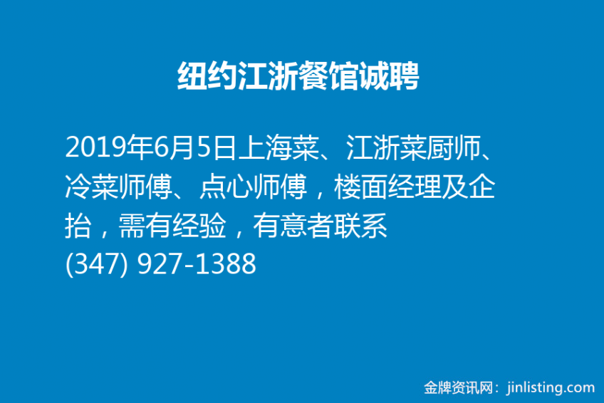 纽约江浙餐馆诚聘 上海菜、江浙菜厨师、冷菜师傅、点心师傅,楼面经理及企抬,需有经验,有意者联系 (347) 927-1388