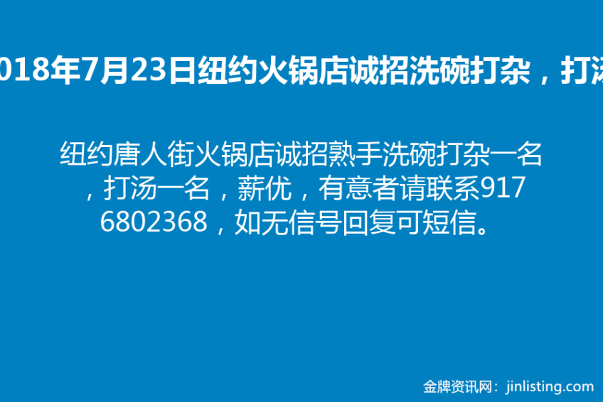 纽约唐人街火锅店诚招熟手洗碗打杂一名,打汤一名,薪优,有意者请联系9176802368,如无信号回复可短信。