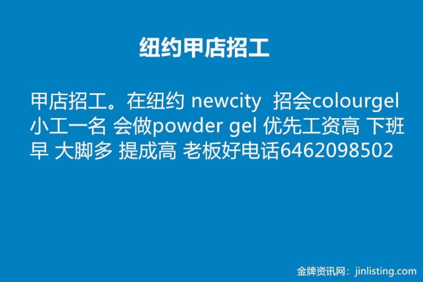 甲店招工。在纽约 newcity 招会colour gel 小工一名 会做powder gel 优先 工资高 下班早 大脚多 提成高 老板好电话6462098502