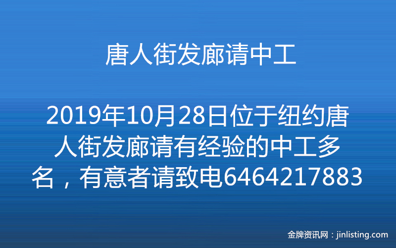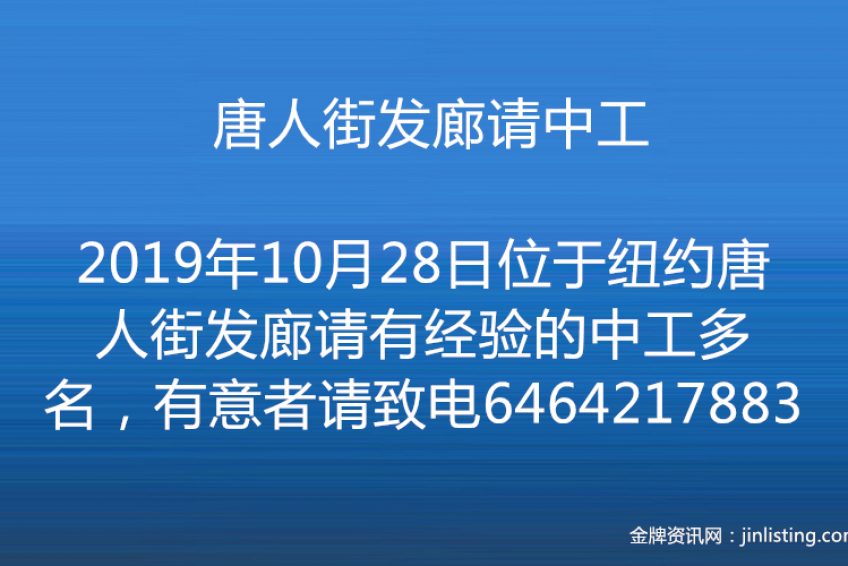 唐人街发廊请中工 位于纽约唐人街发廊请有经验的中工多名,有意者请致电6464217883