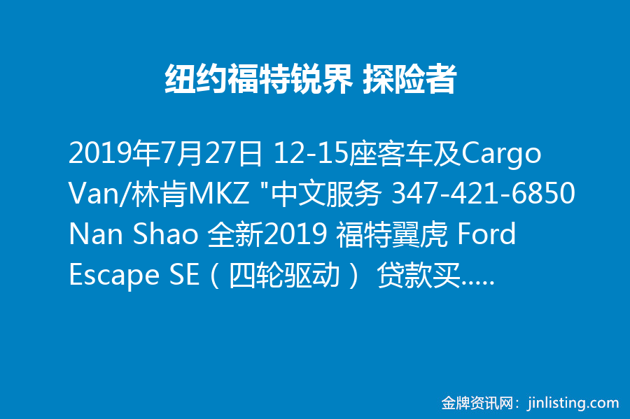 纽约福特锐界/探险者/12-15座客车及Cargo Van/林肯MKZ “中文服务 347-421-6850 Nan Shao 全新2019 福特翼虎 Ford Escape SE(四轮驱动) 贷款买车 0% 利率,共36-60个月 租车:$139/月,共36个月,首付$3,779 全新2019 福特锐界 Ford Edge SE(四轮驱动) 贷款买车 0% 利率,共36-60个月 租车:$219/月,共36个月,首付$3,859 全新2019 福特探险者 Ford Explorer(三排座,四轮驱动) 贷款买车 0% 利率,共36-60个月 租车:$249/月,共36个月,首付$3,889 全新2019 福特全顺客车 Ford Transit(12和15人座)”