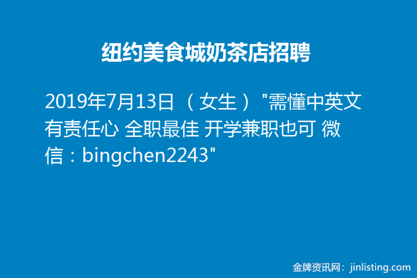 纽约美食城奶茶店招聘 (女生) “需懂中英文 有责任心 全职最佳 开学兼职也可 微信:bingchen2243”