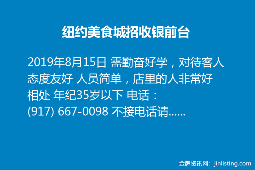 “纽约美食城招收银前台。需勤奋好学,对待客人态度友好 人员简单,店里的人非常好相处 年纪35岁以下 电话: (917) 667-0098 不接电话请短信(9-11)点其余时间勿扰”