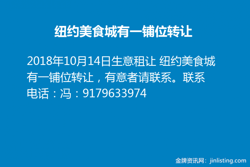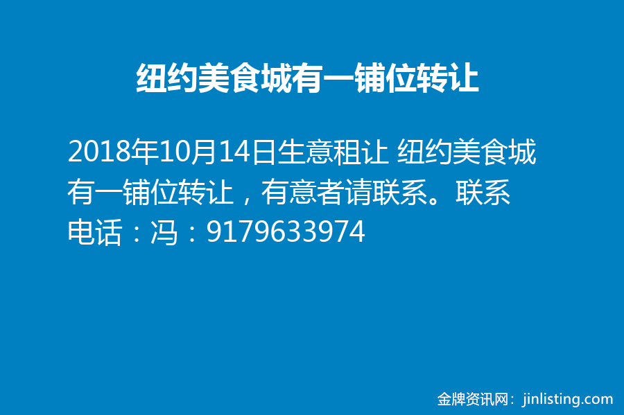生意租让 纽约美食城有一铺位转让,有意者请联系。联系电话:冯:9179633974