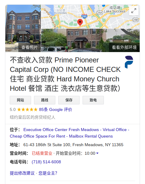 Prime Pioneer Capital Corp. 是一家由纽约财政局(NYDFS)授权的有合法执照的贷款公司。总部设在纽约皇后区新鲜草原。这是一家由华人主理的专业贷款融资公司。华人来这里贷款没有语言障碍。相比美国大银行,这里的贷款政策更宽松,贷款过程更加简单高效。同时,这里的经验丰富的贷款专员还能够帮助客户解决很多贷款疑难问题,许多在别的银行贷款失败的客户,都在这里成功申请到了贷款。