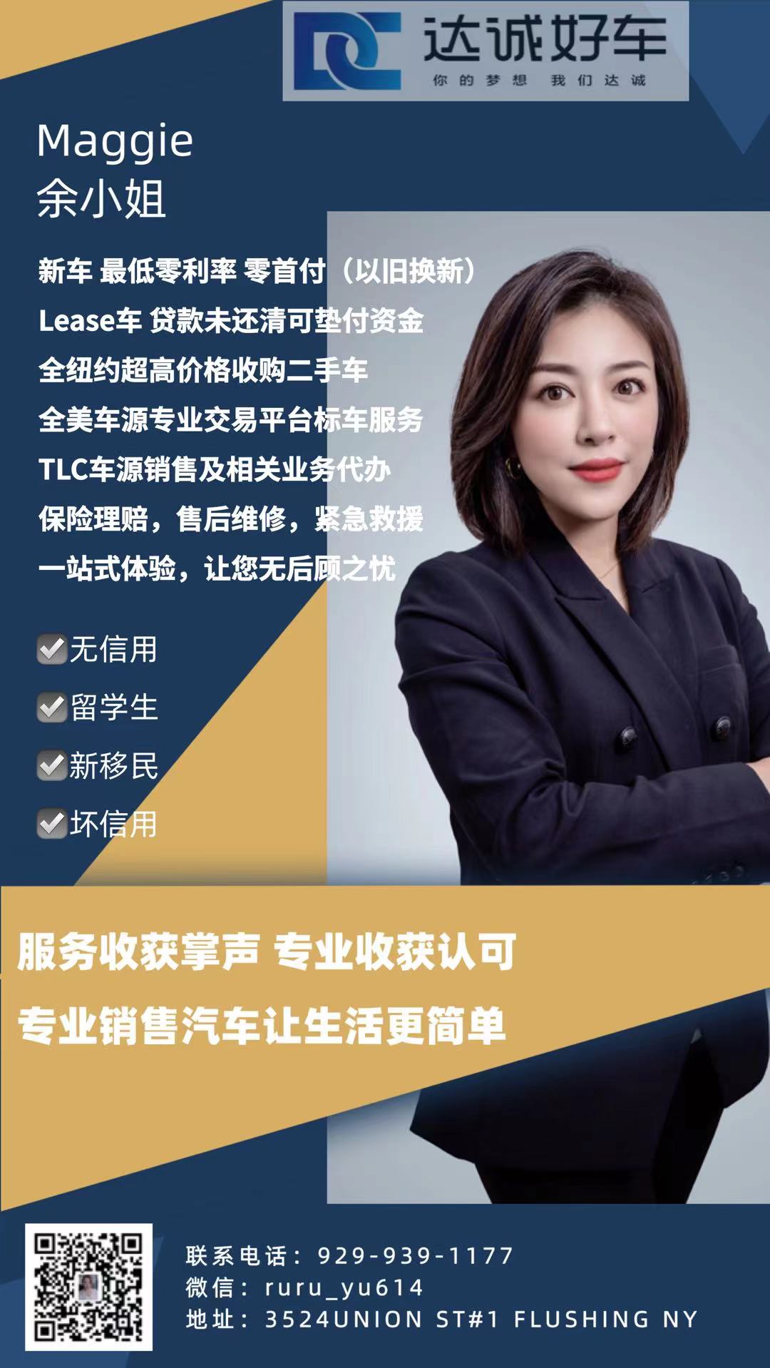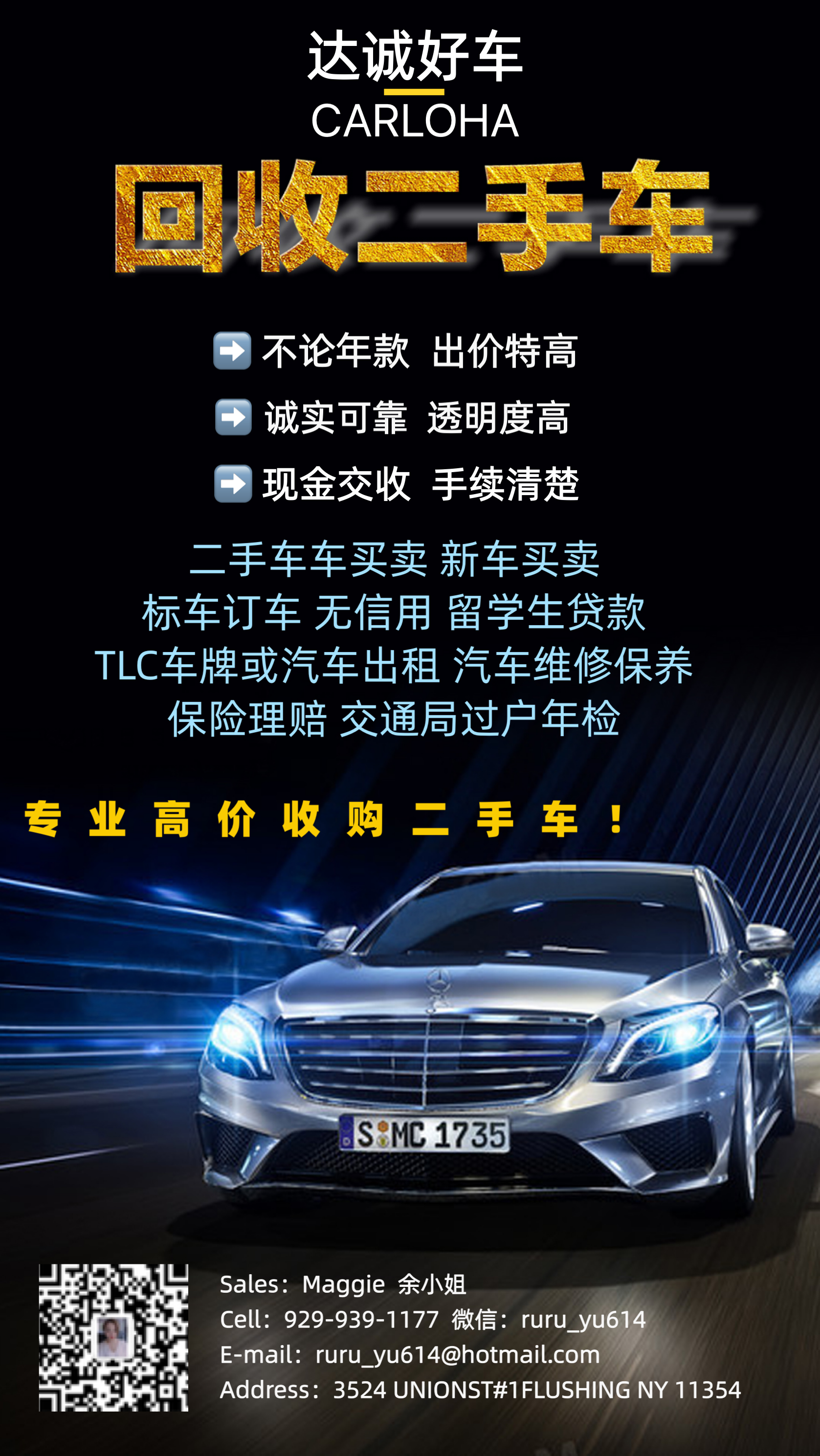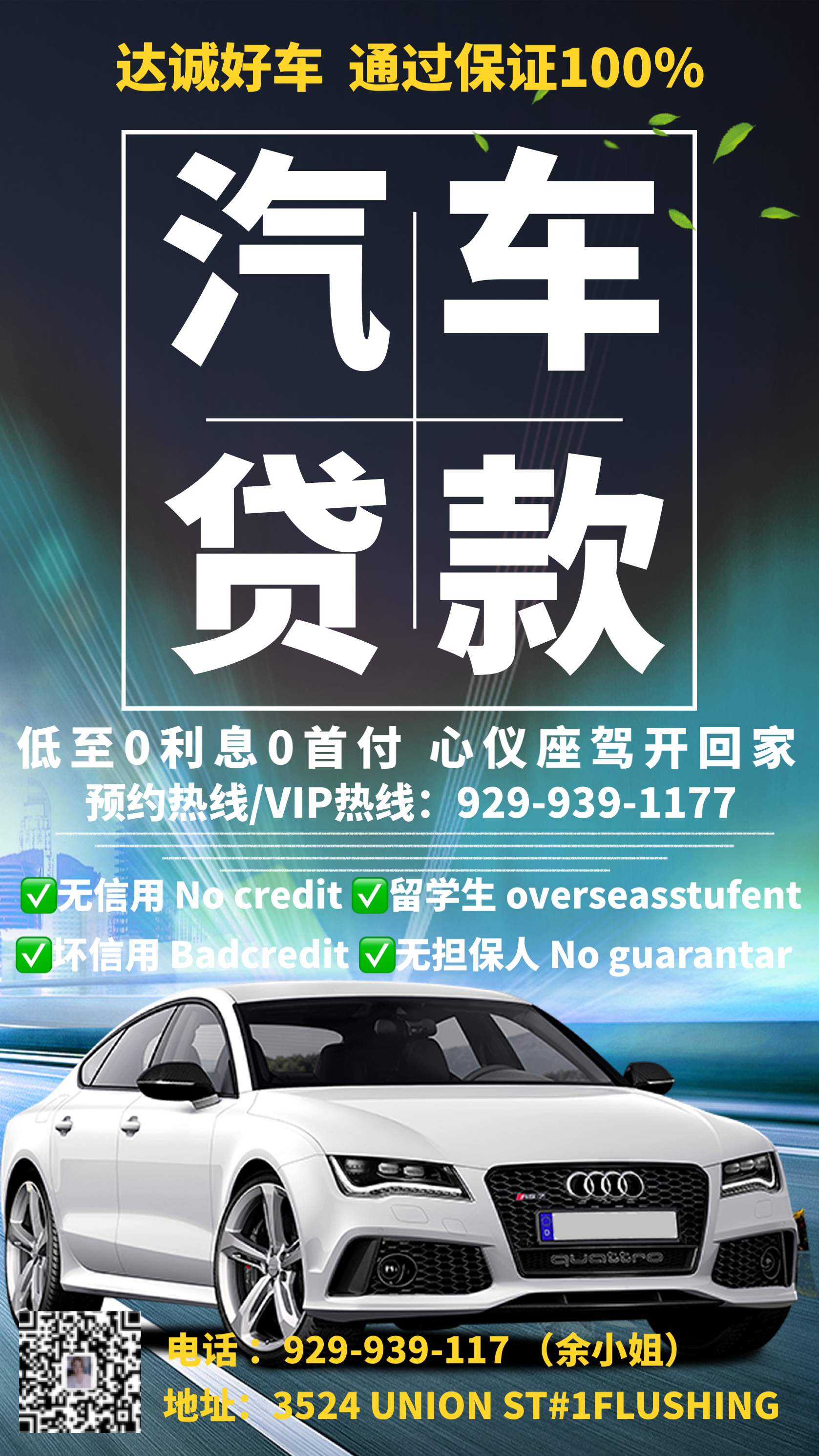 达诚好车 专业高价收购二手车 各品牌特价新车,过百台二手车。(9299391177 余小姐) 无信用、坏信用,留学生汽车贷款,保险理赔,汽车维修,tlc业务,汽车lease 100%质量保证,不卖报废车事故车,无任何隐藏附加费用。为您提供专业购车建议 优质售后服务 专属维修车厂 。 · 达诚好车提供资深验车师傅检查汽车质量,用最好的市场价格快速完成交易。 还能提供通过率接近100%的(无信用贷款服务,留学生贷款服务,坏信用贷款服务,无担保人贷款)。 二手车买卖,新车买卖,标车订车服务,购买车辆后,保险理赔,年审年检,交通局, 汽车维修保养 一条龙服务。 优质售后咨询服务。 高价收购二手车,让你花少钱买新车! . TLC车牌出租,可一起购车保险上牌 。