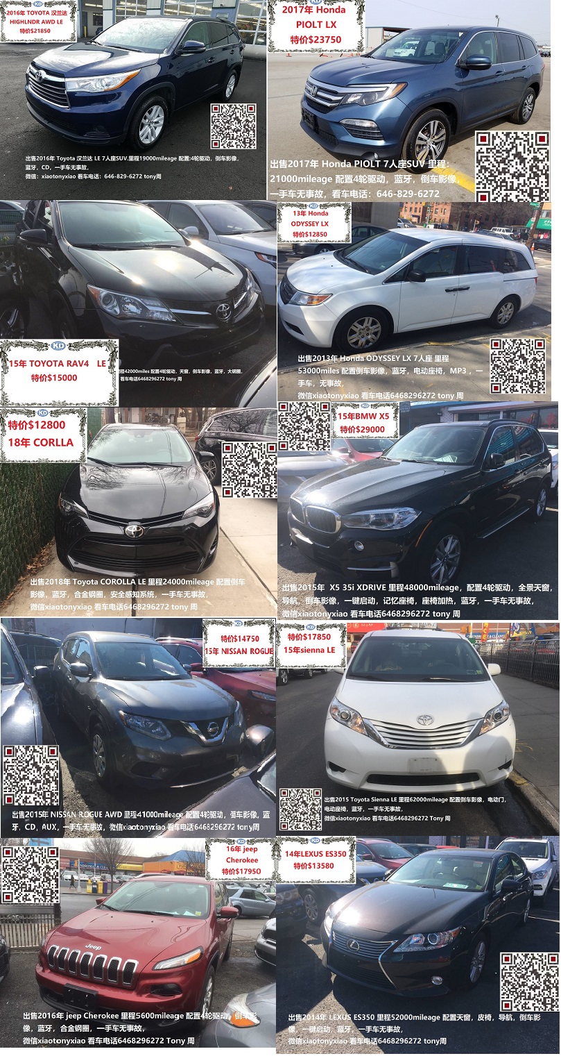 纽约车行特价活动,Toyota $13850,宝马X5$27500,Honda$13850,Nissan$15500
