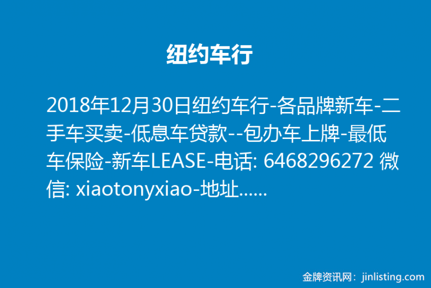 纽约车行—-各品牌新车—–二手车买卖—低息车贷款–包办车上牌—-最低车保险—-新车LEASE—电话: 6468296272 —微信: xiaotonyxiao—-地址:46-24 kissena blvd flushing 11355