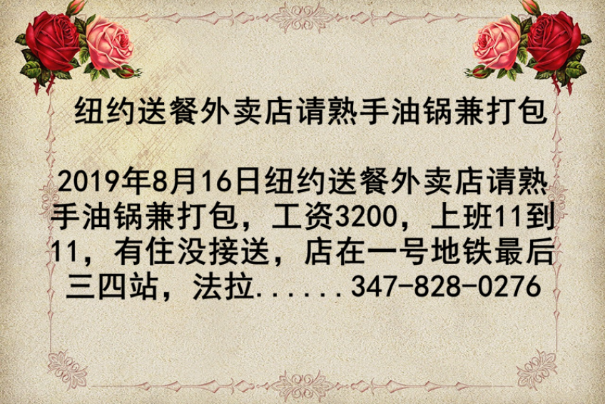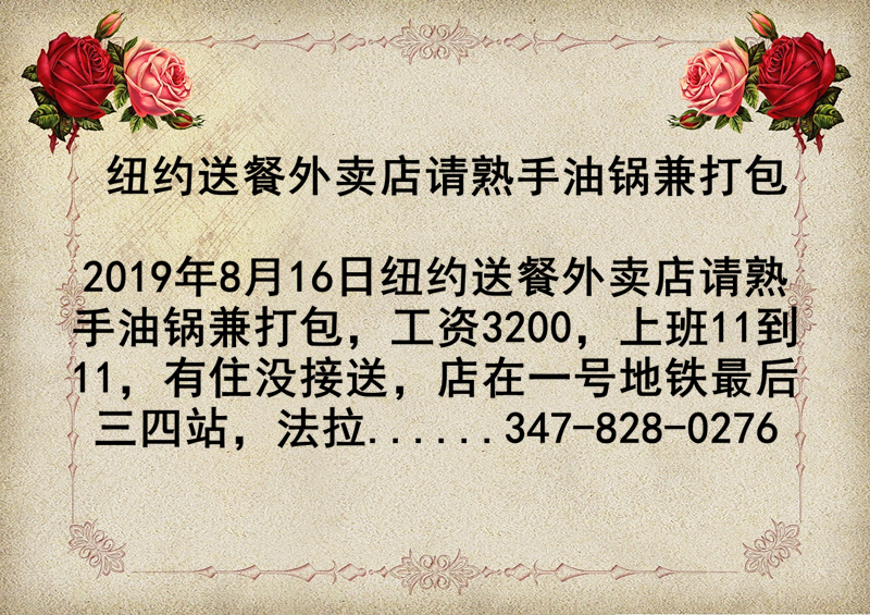 纽约送餐外卖店请熟手油锅兼打包,工资3200,上班11到11,有住没接送,店在一号地铁最后三四站,法拉盛坐地铁一个半小时到,唐人街一个小时到,有意者请拨打电话347-828-0276