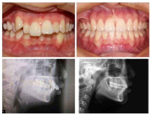 全头xray我们可以看到牙齿矫正前后侧面脸型和嘴型产生的变化。当然,由于她的过咬合非常严重(上下排差距太大),拔去了上牙的左右两颗第一前臼齿,能够把整个上排往后退并调整下排牙齿角度,使牙齿能够达到标准咬合。