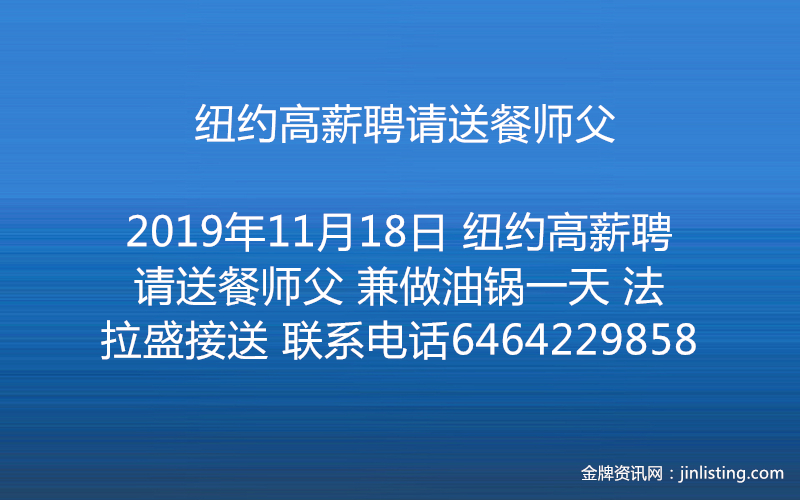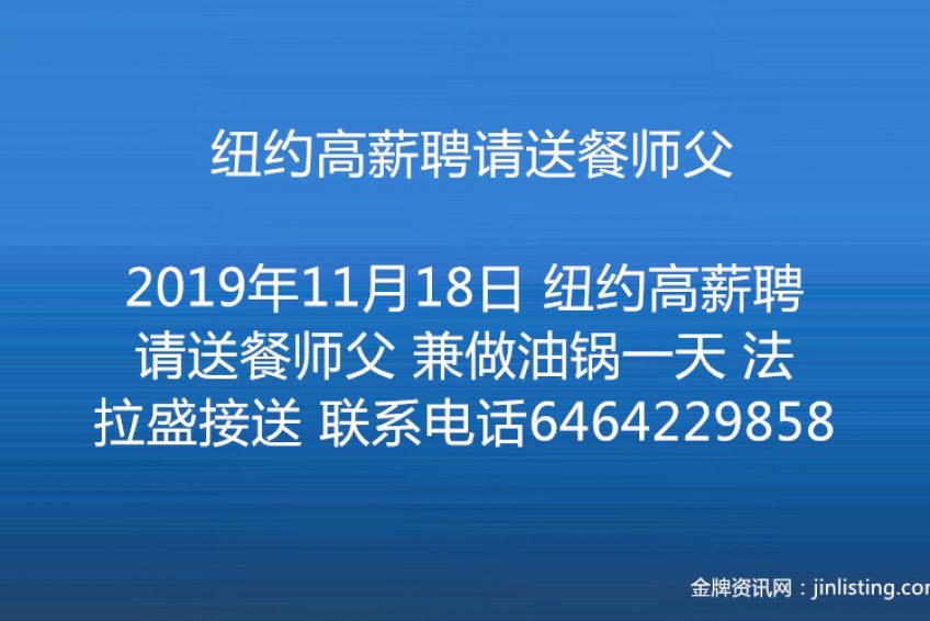 纽约高薪聘请送餐师父 兼做油锅一天 法拉盛接送 联系电话6464229858