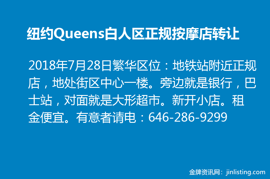 繁华区位:地铁站附近正规店,地处街区中心一楼。旁边就是银行,巴士站,对面就是大形超市。新开小店。可养三个人,租金便宜。因个人原因转让。有意者请电:646-286-9299