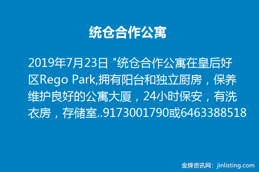 统仓合作公寓(皇后好区雷哥公园)(阳台,独立厨房) “统仓合作公寓在皇后好区Rego Park, 拥有阳台和独立厨房, 保养维护良好的公寓大厦,24小时保安, 有洗衣房,存储室和自行车房, 管理人内住并且可宠物。 管理费$502。近购物,火车和公共汽车。 售$21万! https://www.youtube.com/watch?v=Wkw74tyAD2I 看房从速,请联系美房置业纽约地产 电或微信或短信: Henry He何亨利团队 May9173001790或6463388518何先生”