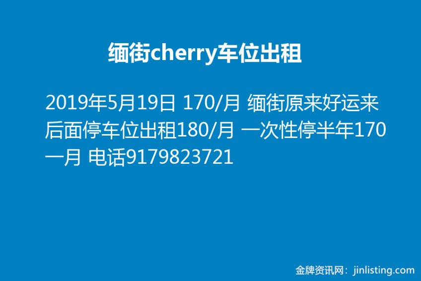 缅街cherry车位出租 170/月 缅街原来好运来后面停车位出租180/月 一次性停半年170一月 电话9179823721
