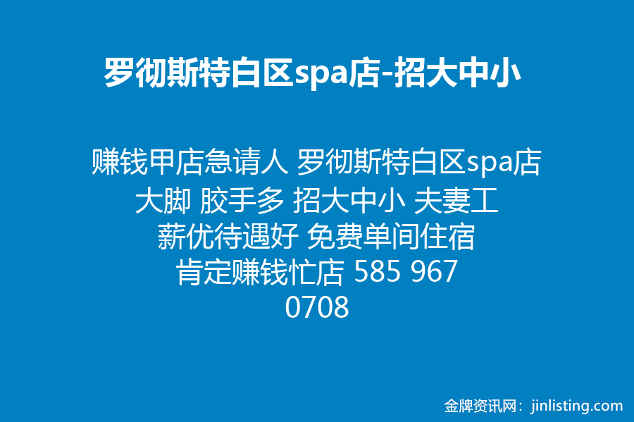 赚钱甲店急请人 罗彻斯特白区spa店 大脚 胶手多 招大中小 夫妻工 薪优待遇好 免费单间住宿 肯定赚钱忙店 585 967 0708