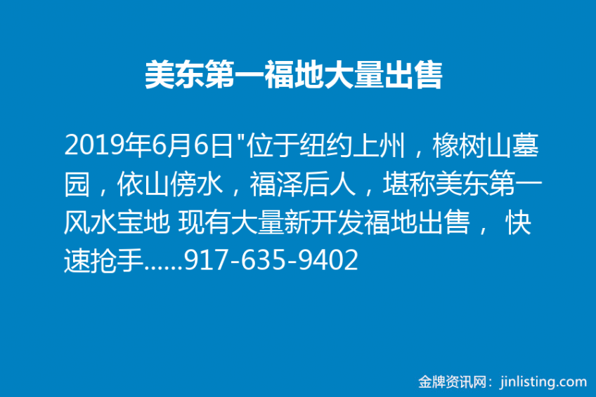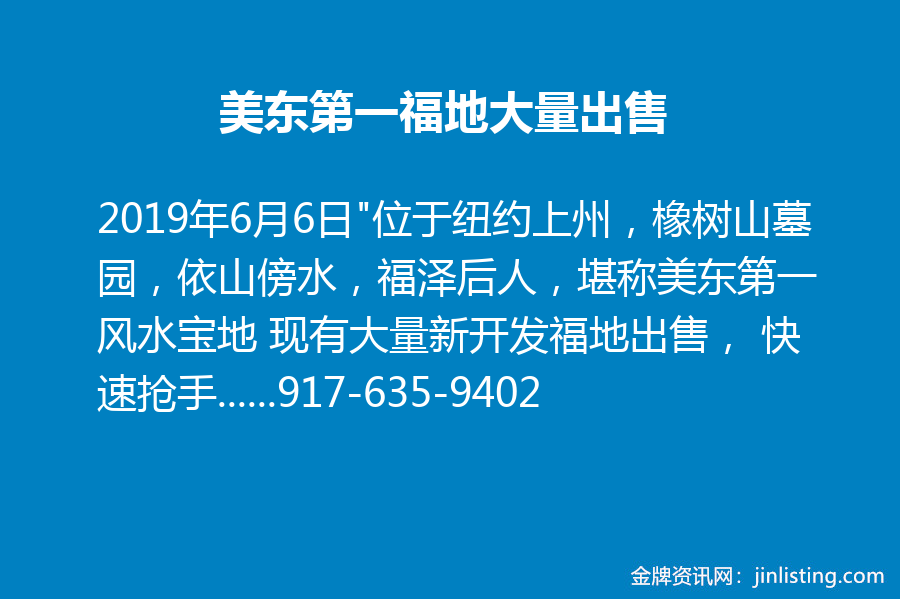 美东第一福地大量出售 “位于纽约上州,橡树山墓园,依山傍水,福泽后人,堪称美东第一风水宝地 现有大量新开发福地出售, 快速抢手。 可预约现场实地参观 有意请短信查询:917-635-9402 或电邮:febusiness2019@gmail.com”