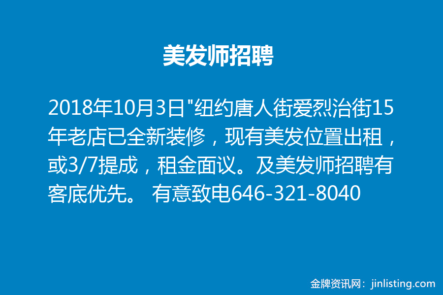 “纽约唐人街爱烈治街15年老店已全新装修,现有美发位置出租,或3/7提成,租金面议。及美发师招聘有客底优先。 有意致电646-321-8040或手机号加微信”