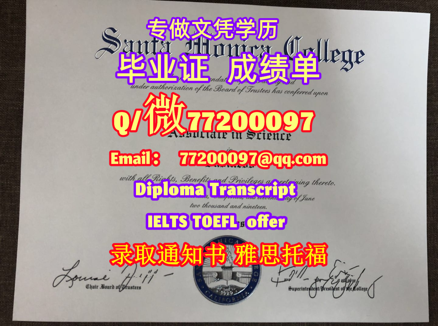 美国学历升级SMC毕业证书定制圣莫尼卡学院学位证书Q/微:77200097有SMC文凭证书精仿SMC学位证书能办SMC成绩单制作圣莫尼卡学院文凭证书雅思托福Santa Monica College Bachelor/Master Diploma Degree Transcript