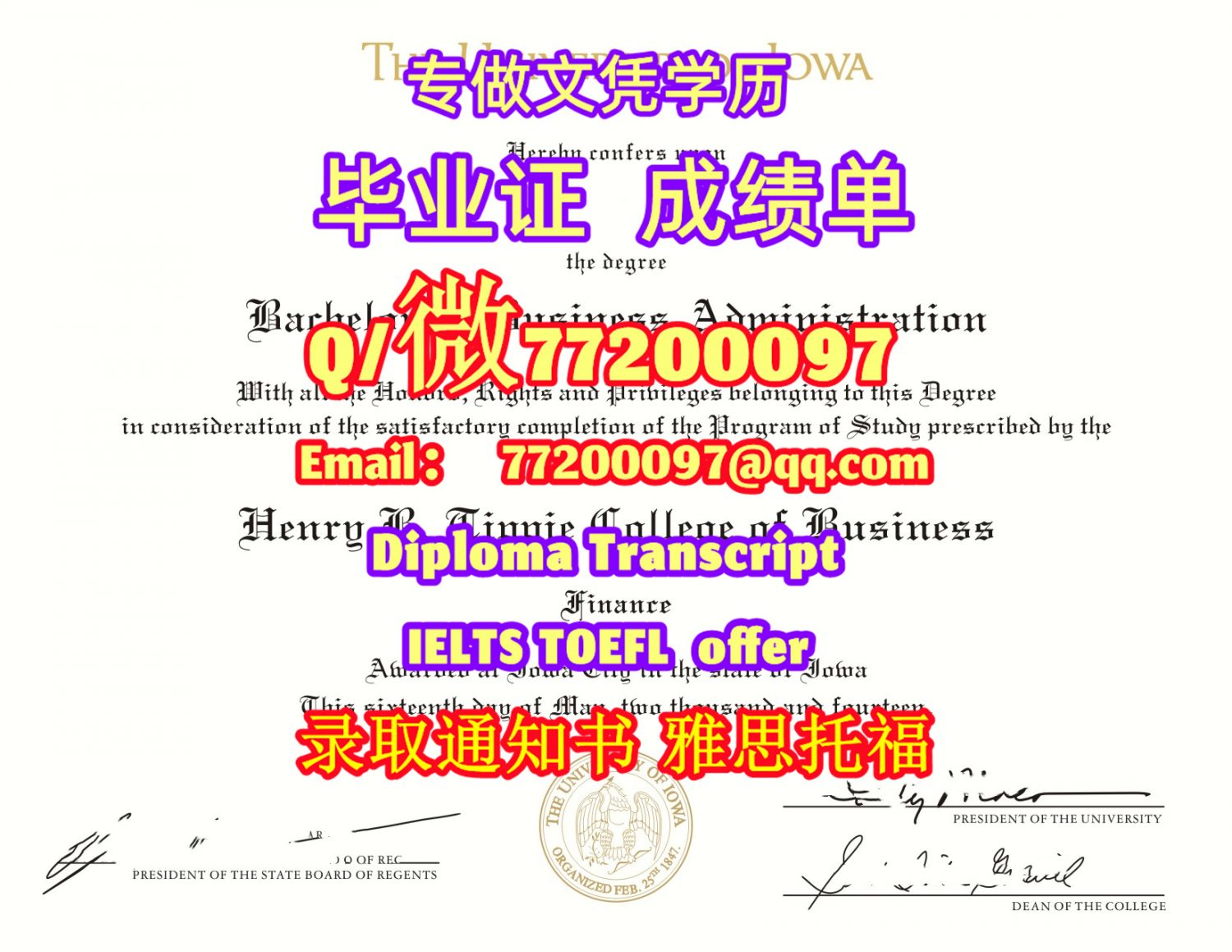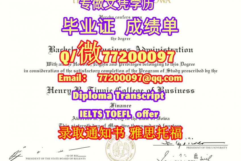 美国学历升级UIowa毕业证书定制爱荷华大学学位证书Q/微:77200097有UIowa文凭证书精仿UIowa学位证书能办UIowa成绩单制作爱荷华大学文凭证书雅思托福University of Iowa Bachelor/Master Diploma Degree Transcript
