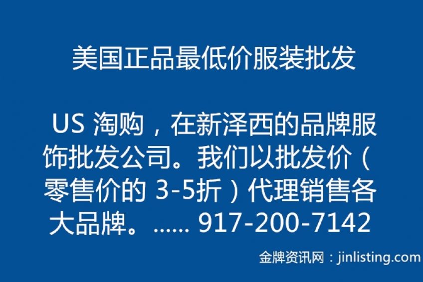 美国正品最低价服装批发 US 淘购, 在新泽西的品牌服饰批发公司。 我们以批发价(零售价的 3-5折)代理销售各大品牌服饰。 主要品牌:CK, CHAMPION, TOMMY HILFIGER, DKNY, LACOSTE, ARMANI, CANADA GOOSE, ARCTERYX , 还有更多品牌 及服饰配件(腰带,背包,鞋子,swarovski,首饰等)。 销售的商品均通过正规供货商或与品牌直接签订销售协议。只销售正品 。 US淘购与各大国内外知名购物中及代购商携手,以最好的价格与服务提供给欧洲,日本,韩国及中国。 我们可提供较市场更具有竞争力的优惠价格, 实现共赢共利。 网站:http://www.ustaogou.com/ 电话 : 917-200-7142 微信 : ustaogou