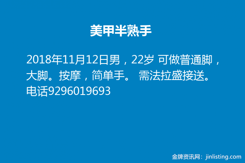 男,22岁 。可做普通脚,大脚。按摩,简单手。 需法拉盛接送。电话9296019693