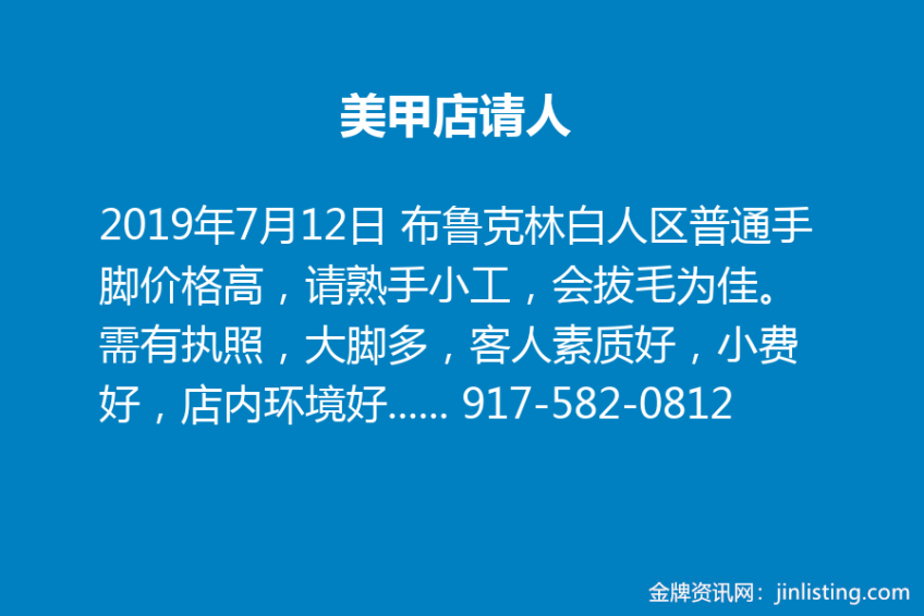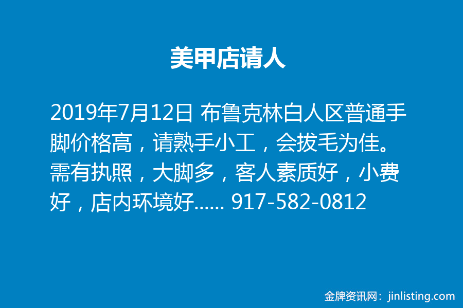 美甲店请人 布鲁克林白人区普通手脚价格高,请熟手小工,会拔毛为佳。需有执照,大脚多,客人素质好,小费好,店内环境好,老板事少。 pt/ft均可。另请有经验、有责任心经理。距离C、N、G、R、F、2、3只有五分钟路程。20分地铁到八大道。联系电话 917-582-0812