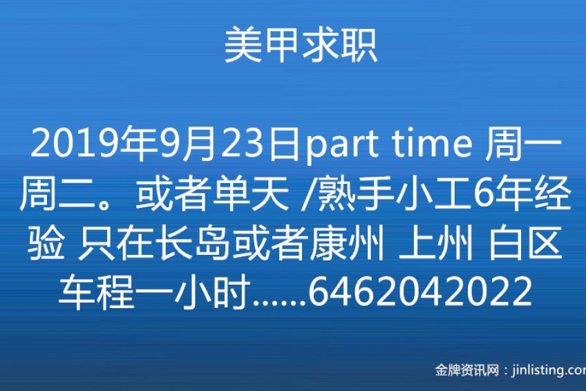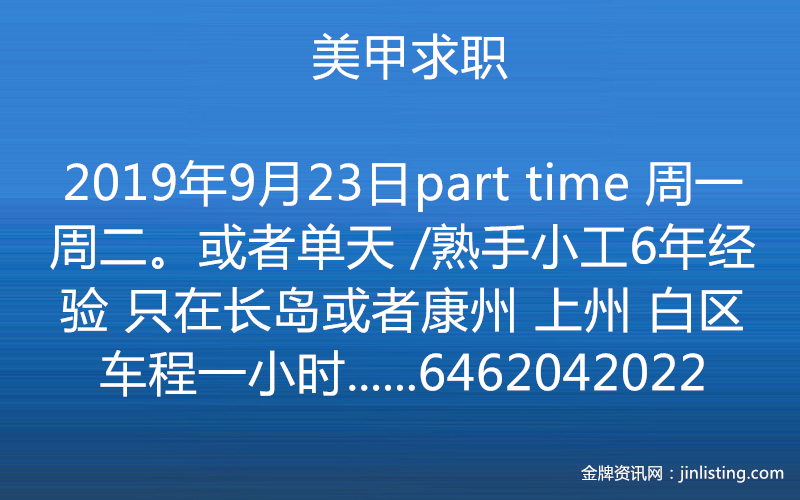 美甲求职 part time 周一周二。或者单天 /熟手小工6年经验 只在长岛或者康州 上州 白区 车程一小时之内。需要的老板请电-6462042022