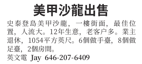 史泰登島美甲沙龍,一楼街面,最佳位置,人流大。