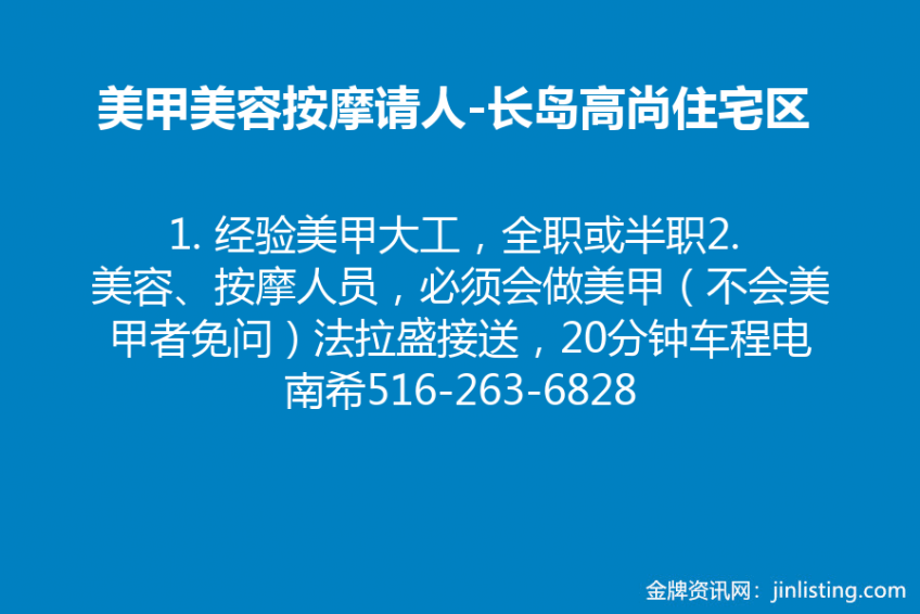 美甲美容按摩请人 “长岛高尚住宅区,高级美容院请如下工作人员: