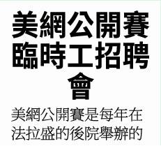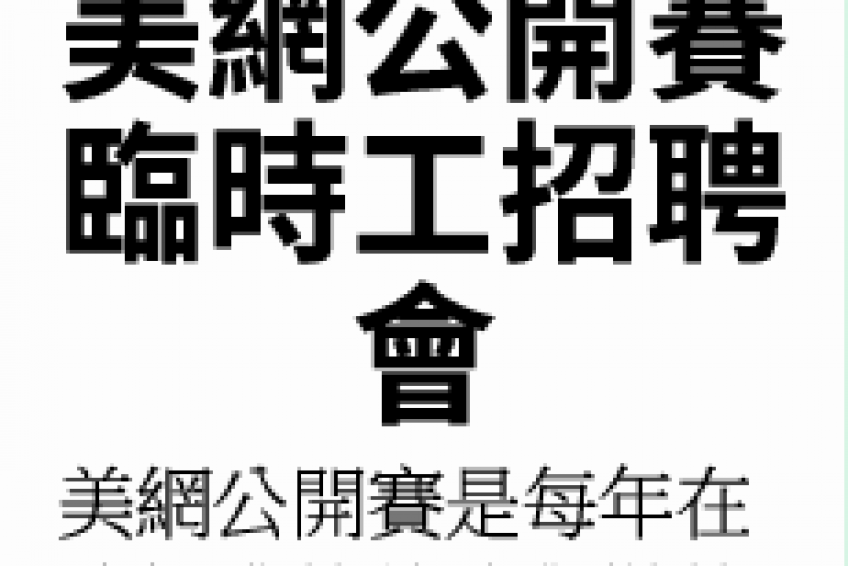 美國網球公開賽(US Open)將於8月29日-9月11日在位於法拉盛草原-可樂娜公園的美網主場館「美網協會莉•珍•金網球中心」(USTA Billie Jean King National Tennis Center)登場,屆時需要大量季節性工作人員。