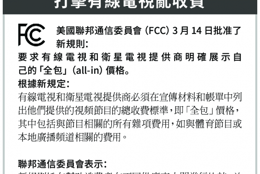 美聯邦通信委員會新規 打擊有線電視亂收費