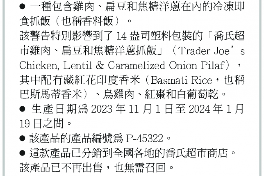 該警告特別影響到了14盎司塑料包裝的「喬氏超市雞肉、扁豆和焦糖洋蔥抓飯」(Trader Joe’s Chicken, Lentil & Caramelized Onion Pilaf),其中配有藏紅花印度香米(Basmati Rice,也稱巴斯馬蒂香米)、烏雞肉、紅棗和白葡萄乾。