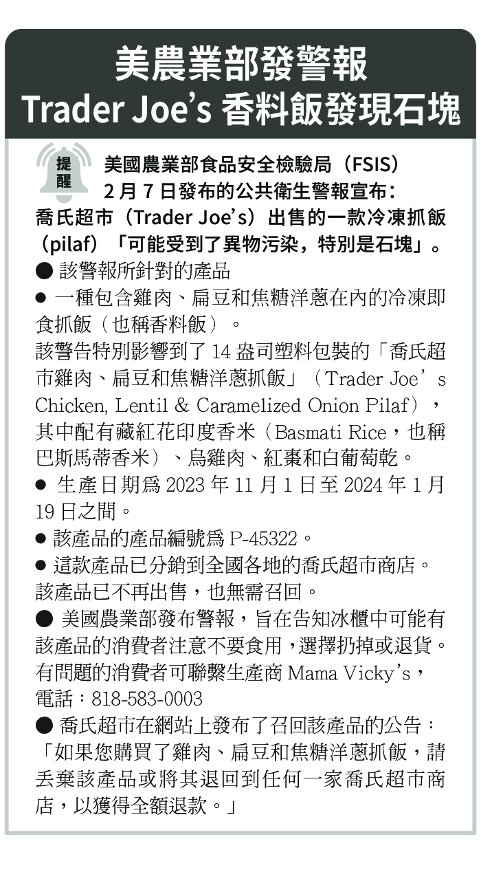 喬氏超市(Trader Joe’s)出售的一款冷凍抓飯(pilaf)「可能受到了異物污染,特別是石塊」。