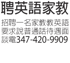 招聘一名家教教英語,要求說普通話、待遇面談,聯繫電話347-420-9909