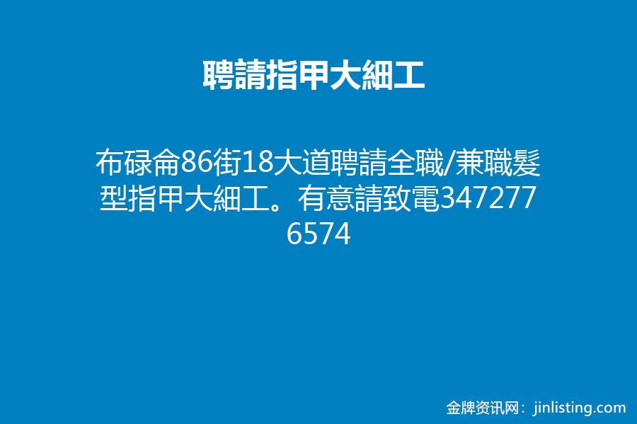布碌侖86街18大道聘請全職/兼職髮型指甲大細工。有意請致電3472776574