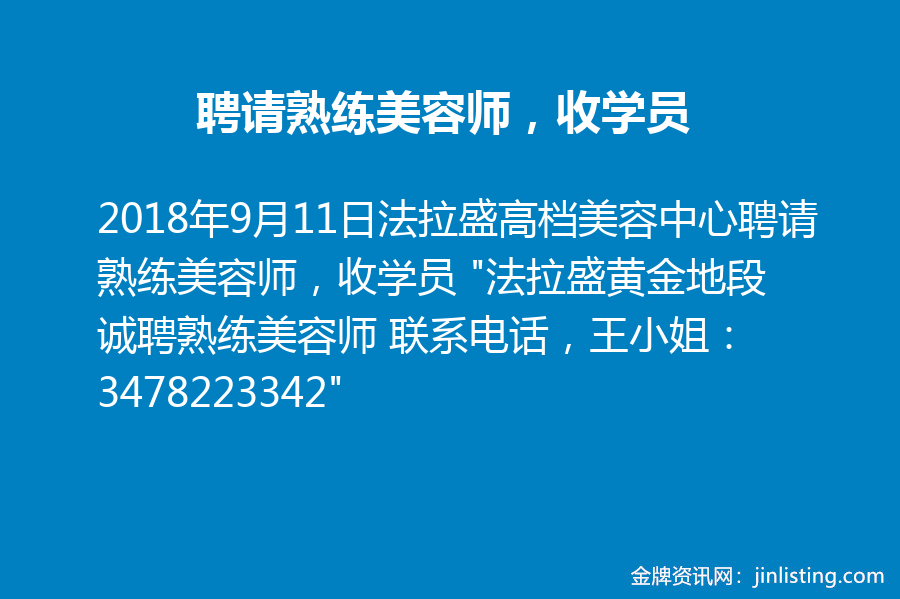 法拉盛高档美容中心聘请熟练美容师,收学员 “法拉盛黄金地段诚聘熟练美容师 联系电话,王小姐:3478223342”