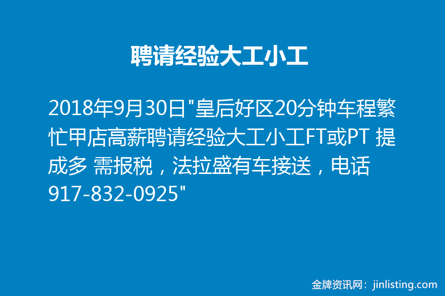 “皇后好区20分钟车程繁忙甲店高薪聘请经验大工小工FT或PT 提成多 需报税,法拉盛有车接送,电话917-832-0925”