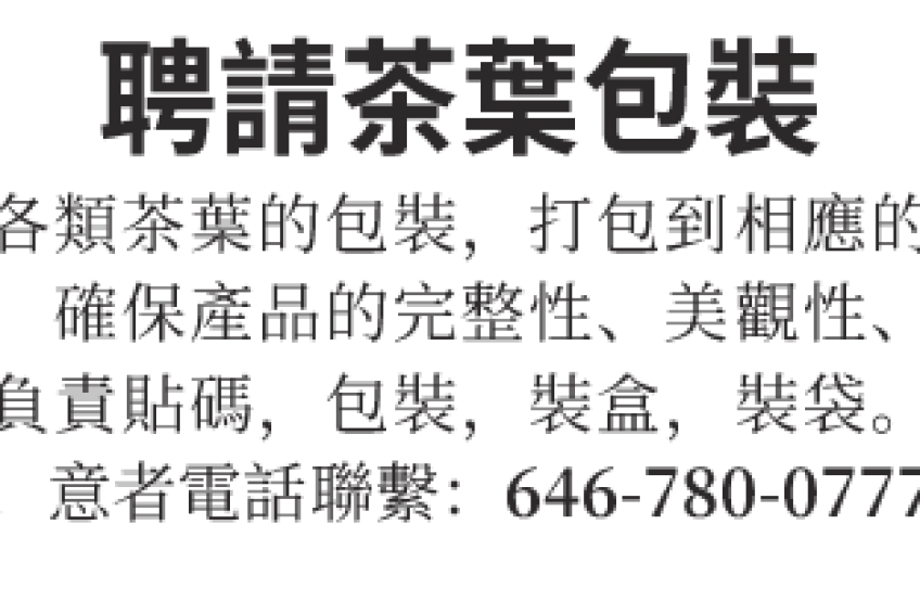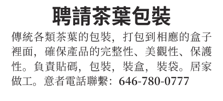 传统各类茶叶的包装, 打包到相应的盒子里面,确保产品的完整性、美观性、保护性。负责贴码,包装,装盒,装袋。居家做工。意者电话联系:646-780-0777