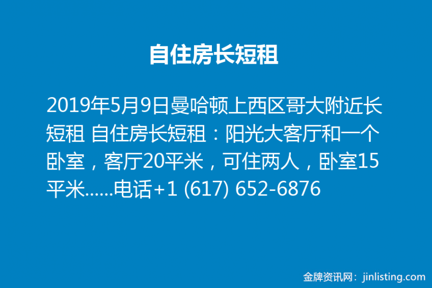 曼哈顿上西区哥大附近长短租 自住房长短租:阳光大客厅和一个卧室,客厅20平米,可住两人,卧室15平米,地址在3333 broadway,2b1b结构,客厅750/月,租期6.17-8.31/2019;卧室1100/月,租期9.1/2019-7.31/2020;周围超市、饭馆林立,生活交通十分便利,步行到地铁一号线3分钟,到哥大主校区15分钟,曼哈顿音乐学院15分钟,City College10分钟,公寓24小时doorman,哥大校车到门口,非常安全!联系方式:微信zhangqionyuan,电话+1 (617) 652-6876,本人非中介,非诚勿扰