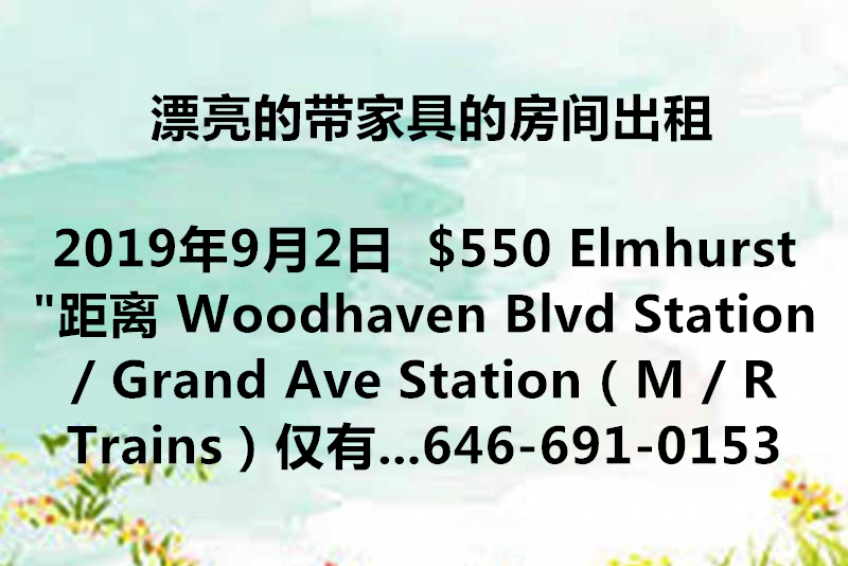 $550 Elmhurst 漂亮的带家具的房间出租 “距离 Woodhaven Blvd Station / Grand Ave Station(M / R Trains)仅有4-6 分钟步行路程,距离曼哈顿约 25-30 分钟。 靠近所有 Queens Center Mall,Target,百思买,银行,药房,医院,洗衣店,公园以及各种餐馆,超市和杂货店,步行3分钟即可到达。 设施齐全,配有床,书桌,椅子,衣柜等。 包括所有公用设施,包括高速互联网。 与其他室友分享浴室和厨房。 非常适合一个人的学生,专业人士和实习生。 现在有空。电话:646-691-0153。 请发送电子邮件至 birdgold7171@yahoo.com,告诉我您自己以及计划入住的时间。 谢谢。”