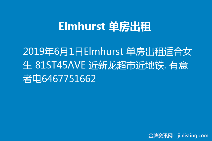 Elmhurst 单房出租适合女生 81ST45AVE 近新龙超市近地铁. 有意者电6467751662
