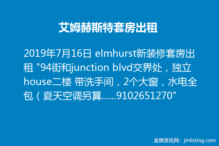 elmhurst新装修套房出租 “94街和junction blvd交界处,独立house二楼 带洗手间,2个大窗,水电全包(夏天空调另算) 附近洗衣店超市,走路7分钟到地铁站, 适合学生或正职人士。 看房请电:9102651270”