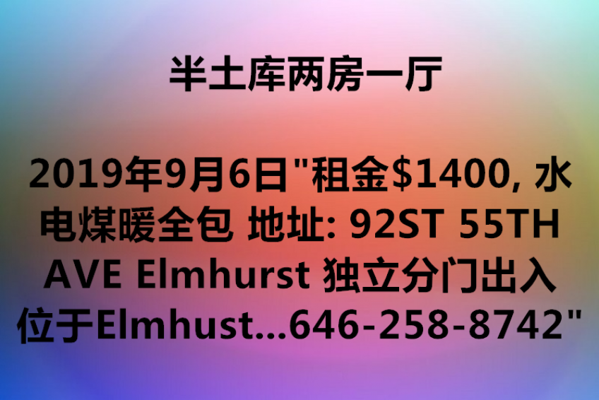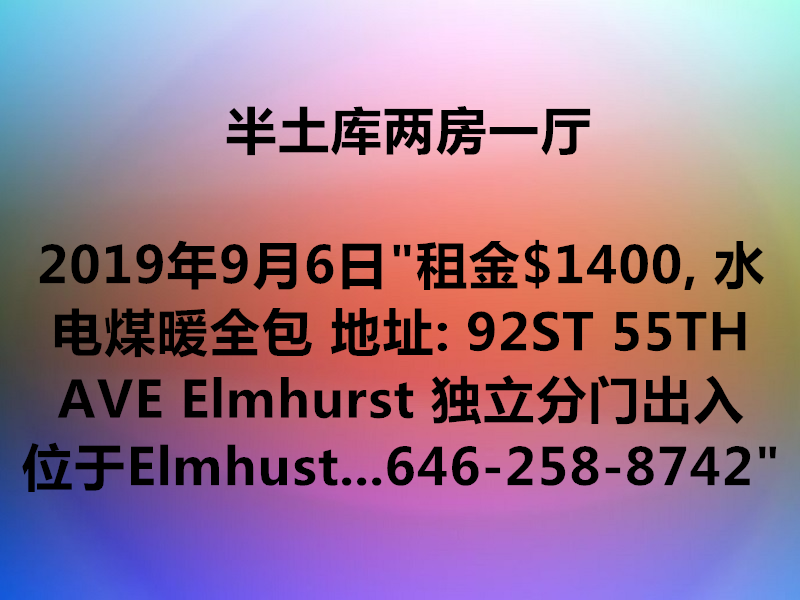 半土库两房一厅 “租金$1400, 水电煤暖全包 地址: 92ST 55TH AVE Elmhurst 独立分门出入 位于Elmhust queenes center mall 离Macy’s, Queens Mall 5分钟,Costco15分钟,华人超市15分钟, 周边餐馆众多 有M,R地铁且离2个地铁出口站只需10分钟 联系人: 陈先生 联系电话: 646-258-8742”