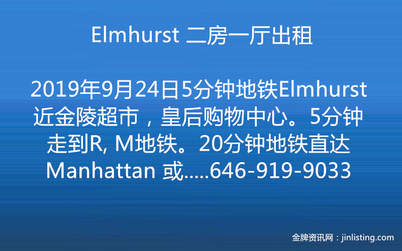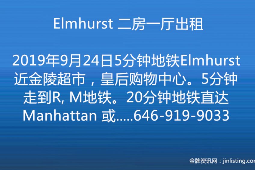 5分钟地铁Elmhurst 二房一厅出租 Elmhurst 近金陵超市,皇后购物中心。5分钟走到R, M地铁。20分钟地铁直达Manhattan 或Flushing. 9分小学,中学PS 102. House 二楼二房一厅出租$2000/月。包水。不抽烟,无宠物。租客付佣金。Call Cindy Chen 646-919-9033